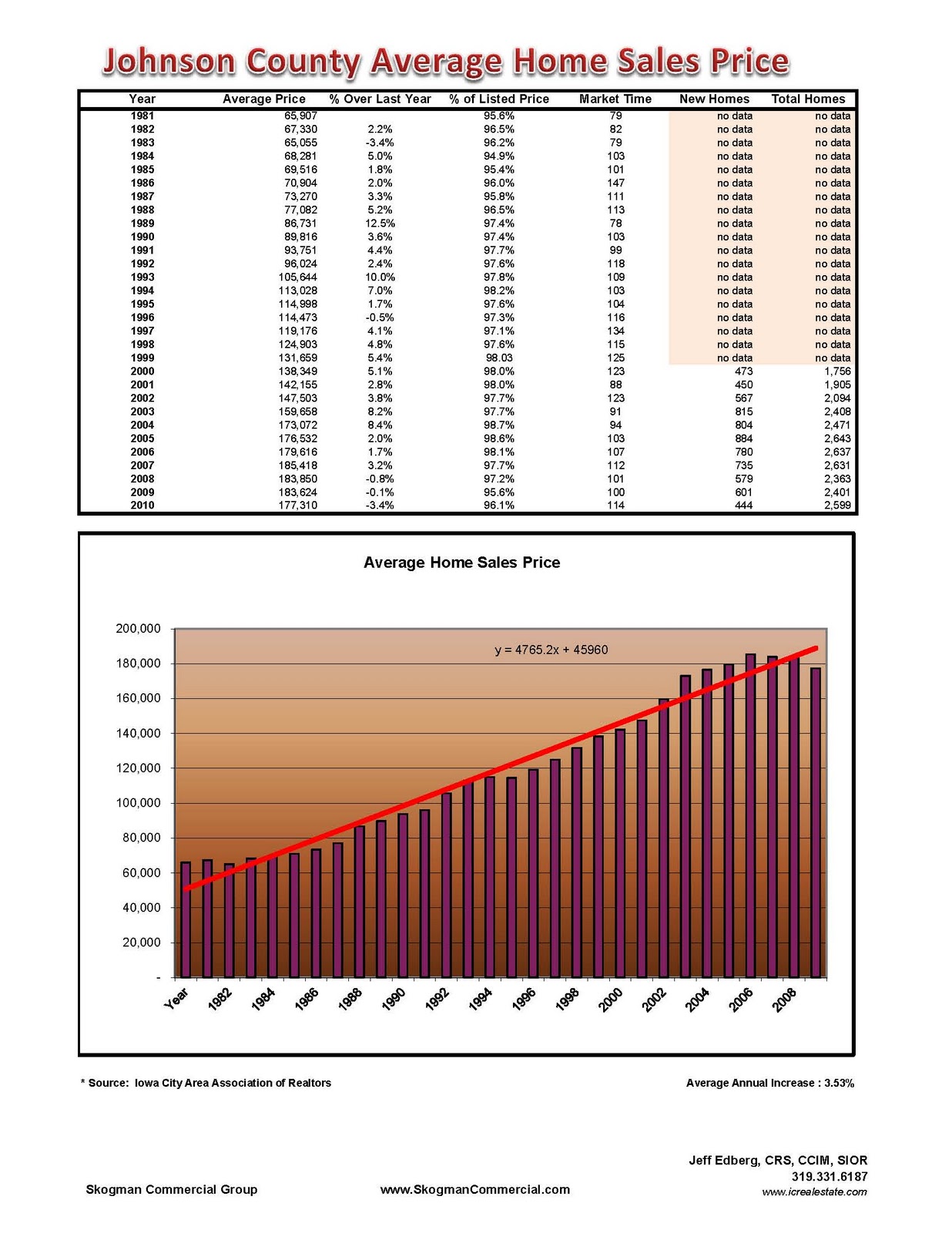 2011 has begun and so has the Iowa City / Coralville Skogman Commercial office. Let’s take a look and see how both fare. I track the average home sales price, the price increase and the list price / sales price ratio as an indicator for the overall health of the Iowa City / Coralville real estate market. In the 29 years I have been tracking this indicator, there has never been as large a decrease as there was in 2010. The average home sales price was $177,310 in 2010, a 3.4% drop from the previous year. Since 2007 the average price has gone down a total of 4.3%. This is no doubt the result of an overheated marked fueled by a feeling of prosperity combined with low interest rates resulting in higher than normal prices. On the attached graph you can see this from 2002 through 2007, and then price declines starting in 2008. Does this indicate a problem for the future of the residential market value? No, it is merely a much needed adjustment so this market can get back on track in a predictable, steady manner. Note that the number of residential sales is 2,599, just shy of the 2,643 sold in 2005 – a banner year!